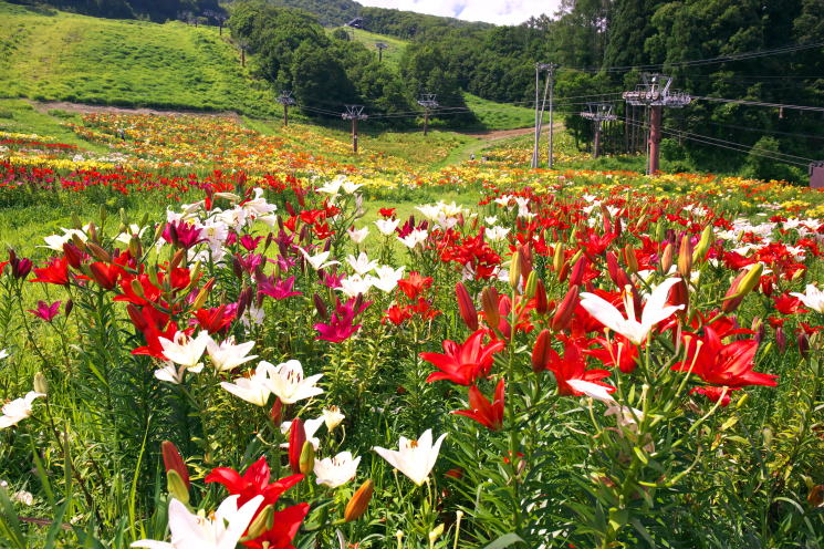 右手リフト方向を見る・・・赤、白、黄色のゆりがバランスよく咲く