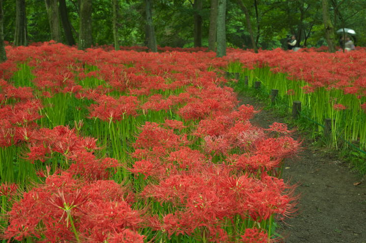 | 有名な巾着田の曼珠沙華(埼玉・日高市)、ようやく訪問することができました。 家から高速道を飛ばせば2時間弱で来られるところ、早朝出発で7時には駐車場に到着し早速、園内を散策しました。 この巾着田は高麗川(こまがわ)の蛇行の形がきんちゃくの形に似ていることから名付けられたもので、直径約500メートル、面積約22ヘクタールの川に囲まれた平地には曼珠沙華(まんじゅしゃげ)の一大群生地(500万本)があります。一週間前の台風18号の暴風雨にもめげず、一面真紅に染った曼珠沙華(彼岸花)のジュータンが見事なたたずまいで広がっていました・・・。 |