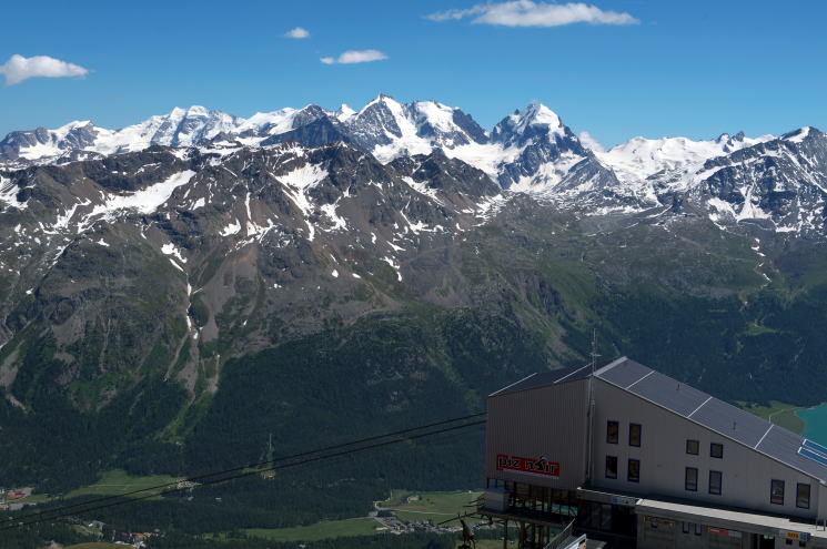 上の写真から右手方向のベルニナ連山・・・チャンプフェール湖、シルヴァプラナ湖も見える |