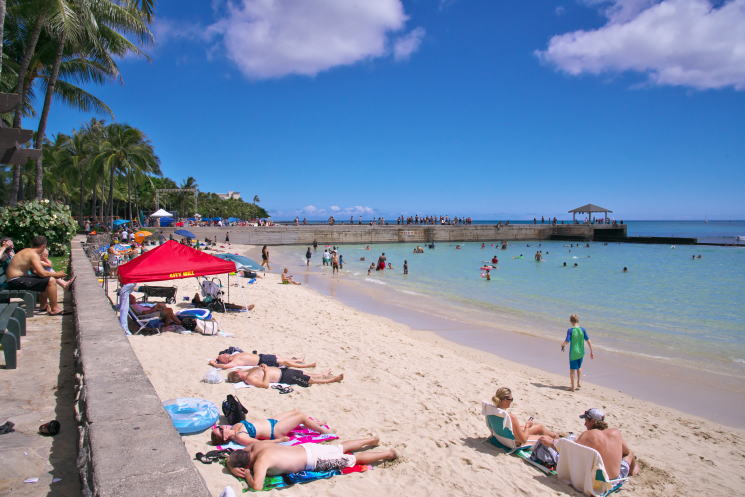 | ワイキキ・ビーチは東のカピオラニ公園から西のヒルトン・ハワイアンビレッジまで、約3kmに渡ってつづく三日月型の美しいビーチです。一般的にこのビーチを総称してワイキキ・ビーチと呼んでいますが、正確には幾つかのビーチが連なっていて、 カピオラニ・ビーチ、ワイキキ、クヒオ・ビーチ、グレイズ、フォート・デ・ルーシーなどの名前が付いています。 |