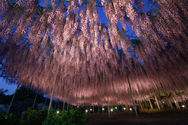 | 藤の花めぐり”で訪れた「世界が息を呑んだ美しさ」の足利フラワーパークです。午後の3時に入園しライトアップまで数時間粘って、夜陰に輝く藤のライトアップ写真をカメラに収めました。 |