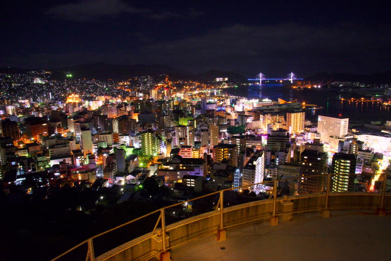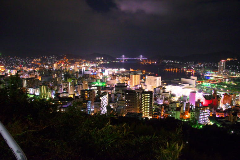 | 長崎の夜景は日本三大夜景の一つで、「1000万ドルの夜景」と称されてますます人気が出ているようです。夜景めぐりも私のテーマの一つなので、少なくとも日本三大夜景に選ばれている長崎の夜景はどうしても見なくてはなりません、その機会が今日ようやく訪れました。ホテル長崎に宿泊というのでここからの長崎の夜景を見るのが楽しみでした。そして、重い雲が垂れ込めた長崎の夜景でしたが、ホテル長崎前の路上と7階の部屋からの見応えのある夜景を撮影することができ大変満足しています。 |