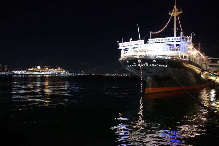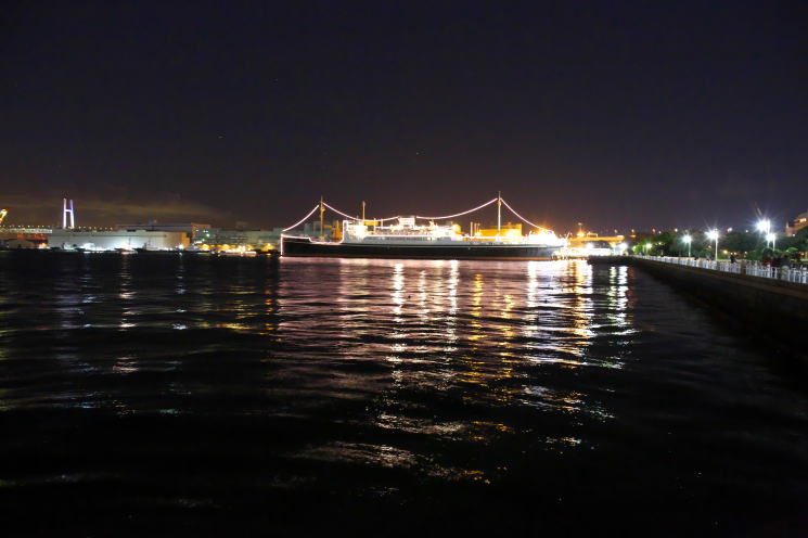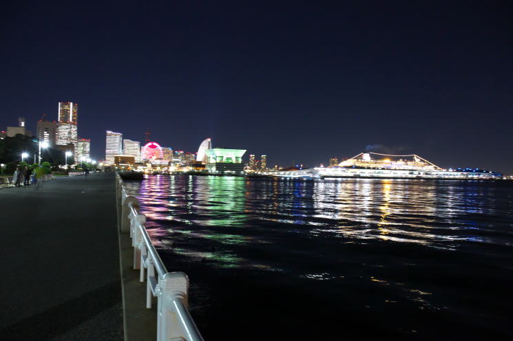 | 横浜の夜景で「日本夜景遺産」にも選定されている山下公園からの絶景です。この公園は昭和5年の開園で、夜ともなるとイルミネーションで彩られた山下公園のシンボル・氷川丸や横浜港大さん橋国際客船ターミナルそして、きらびやかに輝くみなとみらい21のビル群など見事な夜景が広がります。横浜マリンタワーからの夜景を楽しんだ後、山下公園に入り大さん橋ターミナルまで写真を撮りながらゆっくりと散策してきました。山下公園からの夜景は水面に光る柔らかな光線が建物群の光に融合して、趣のある夜景を演出しています。 |