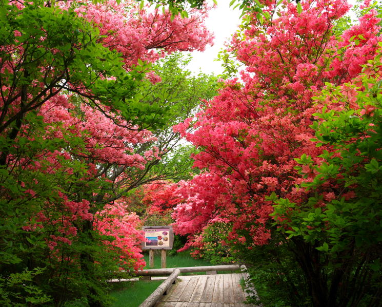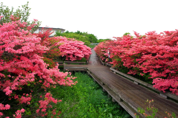 鮮やかなヤマツツジに囲まれる木道(上下の写真 |