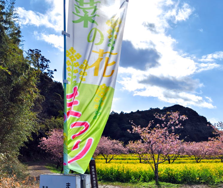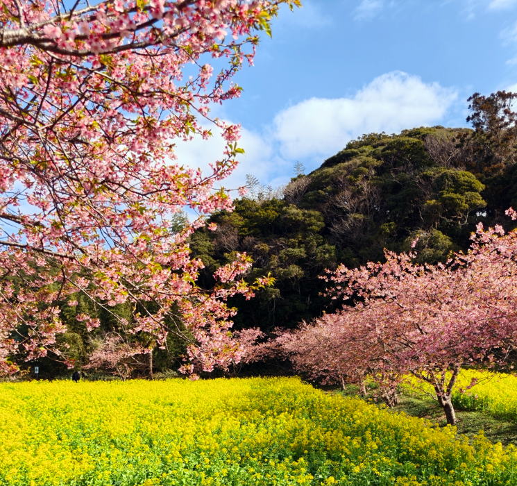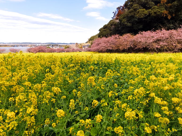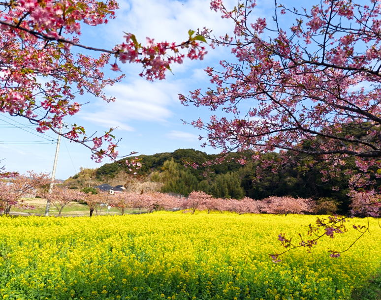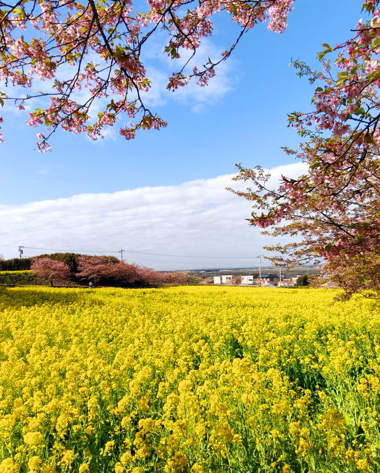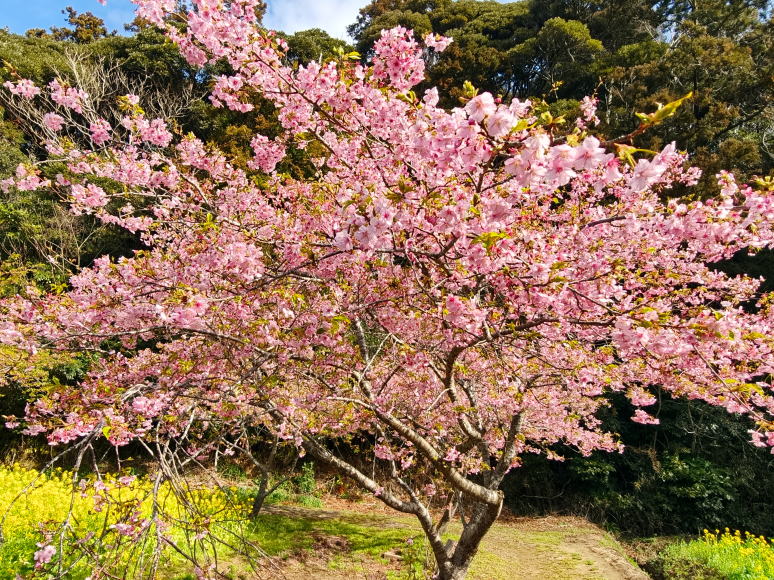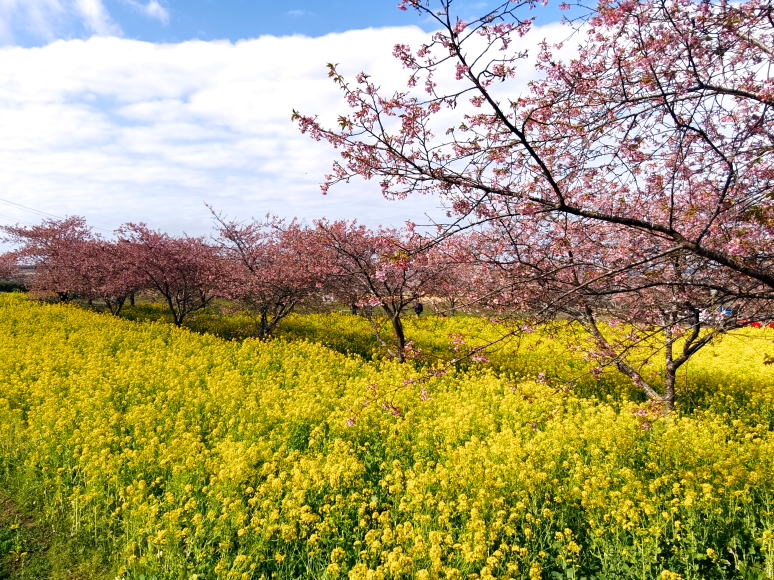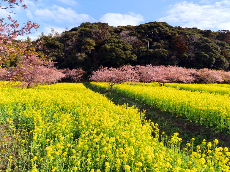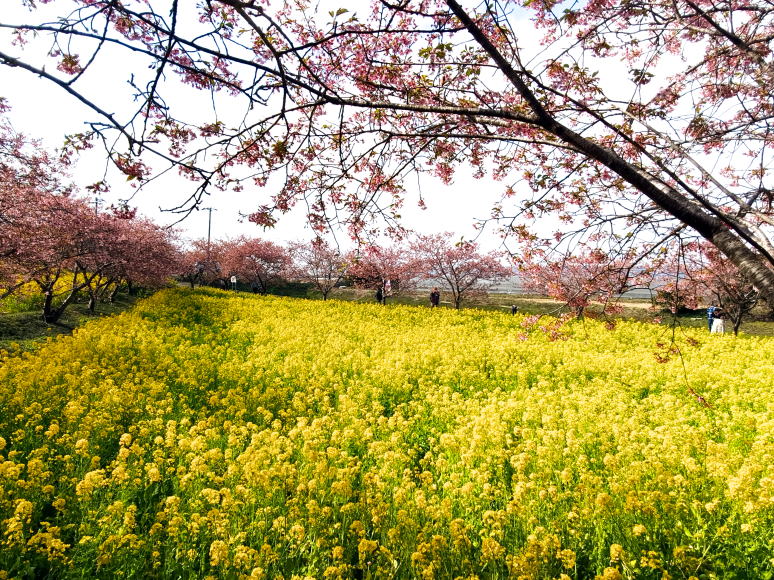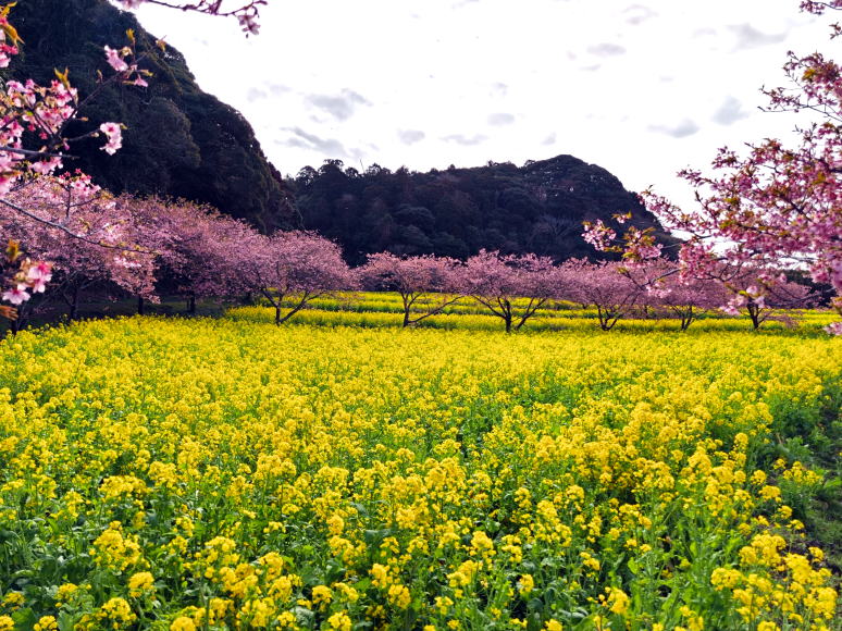 満開の河津桜と菜の花畑・・・反時計回りで一周します |