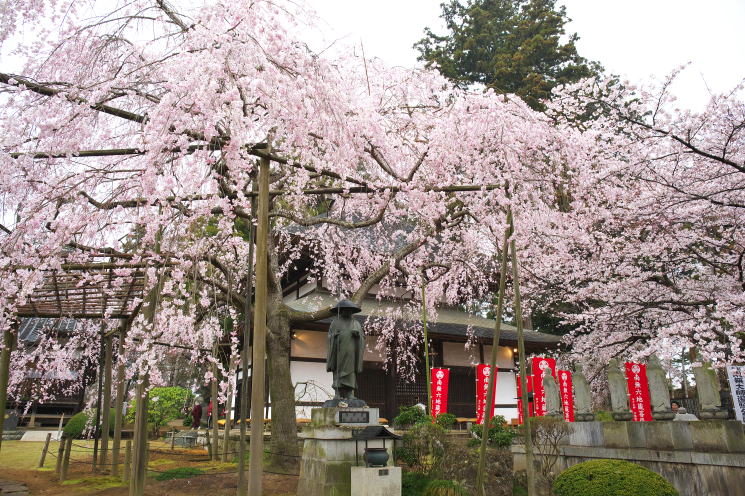 | 水戸市の中心街からかなり離れた位置にある六地蔵寺の枝垂れ桜です。今日はこの六地蔵寺の枝垂れ桜をメインに、この方面の桜めぐりをしてきました。この六地蔵寺の創建は古く、807年ごろと言われており、水戸藩第2代藩主徳川光圀公ゆかりの寺としても知られています。そして、境内には光圀公が鑑賞した桜の子孫といわれる枝垂れ桜があり、毎年多くの花見客が訪れるという。さらに、境内には樹齢1,100年の大杉や800年の大銀杏もあって、茨城百景にも指定されている景勝地です。 |
