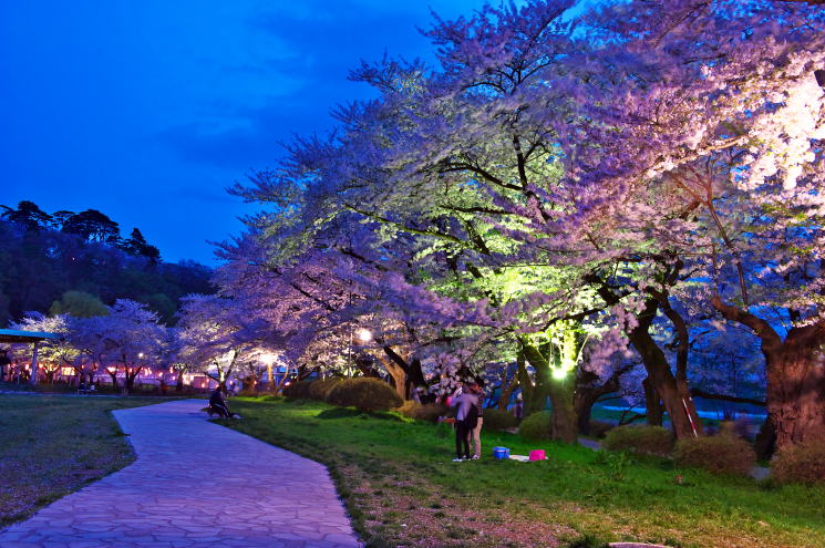 | 北上夜曲で有名な北上展勝地の桜です。かつて、歌声喫茶などでよく口ずさんだ「北上夜曲」のあの旋律は今も脳裏を刺激し、歌うほどにセンチメンタルな気分にさせられます。そして、日本さくら名所100選の一つに選ばれている北上展勝地の桜は5~7分咲きと思って訪ねると、もう満開のピークで、場所によっては散ってきたところもありました。ゆうゆうと流れる北上川沿いに2kmに渡って作る桜のトンネルは東北の三大桜名所といわれています、今日はとりわけロマンチックな気分に浸りながら北上展勝地の桜を愛でてきました・・・。なお、夜桜も撮ってみましたが、全体的に暗い感じだったのであまり期待せず、早々にひきあげることにしました。 |