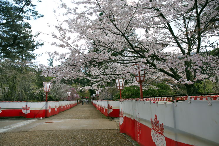 霊宝館前の桜並木・・・右手は雨月茶屋 |